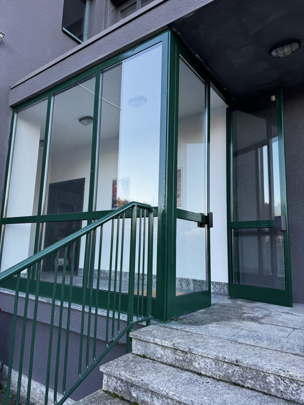 L’esposizione del locale è decisamente gradevole in quanto 2 lati, a sud e ovest, sono totalmente stati costruiti con vetrate cielo/terra, di conseguenza molto luminoso e con vista su zona verde.